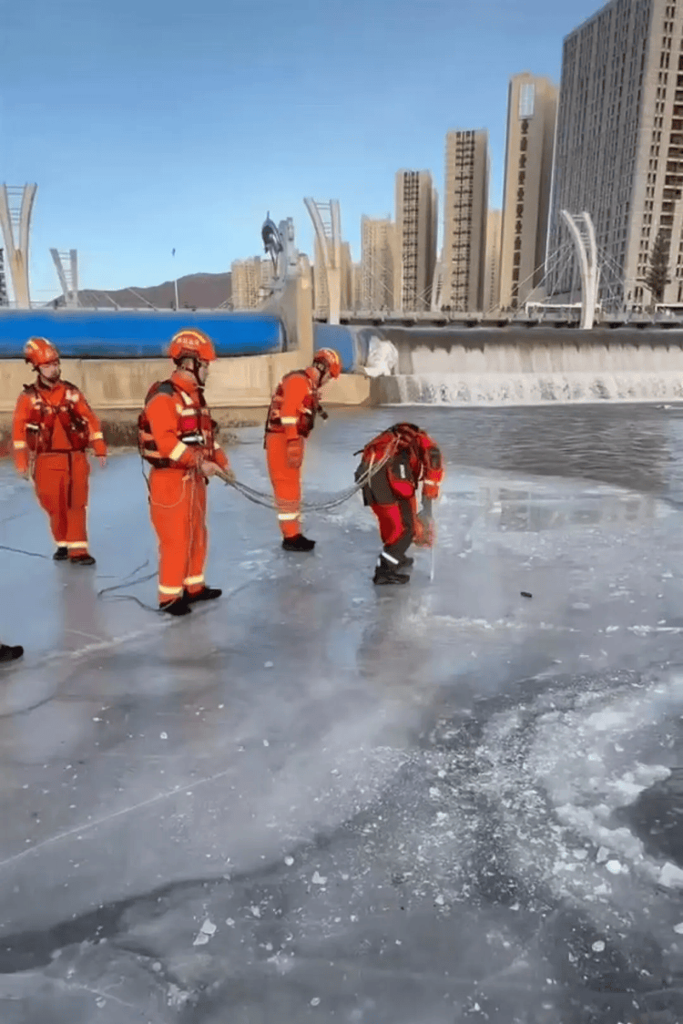 网传现场画面显示,结冰的水面上有多名救援人员正在切割冰面进行救援,岸边围满了人群,多辆消防车停在路边,车灯闪烁。