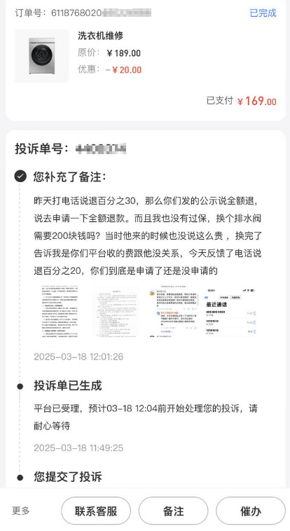 “代金券补偿”是引发消费者不满的焦点。啄木鸟官方声称区分保内外,但实际操作中,有消费者反映无论何种情况,都被强推代金券。有用户投诉3笔乱收费订单,处理完一笔后,另两笔被以“过保”为由拒绝处理,仅追加提供50元代金券,当用户指出“不是保修期的问题,是你们乱收费的问题”并拒绝接受时,客服强硬回复“你不接受我也没办法”。