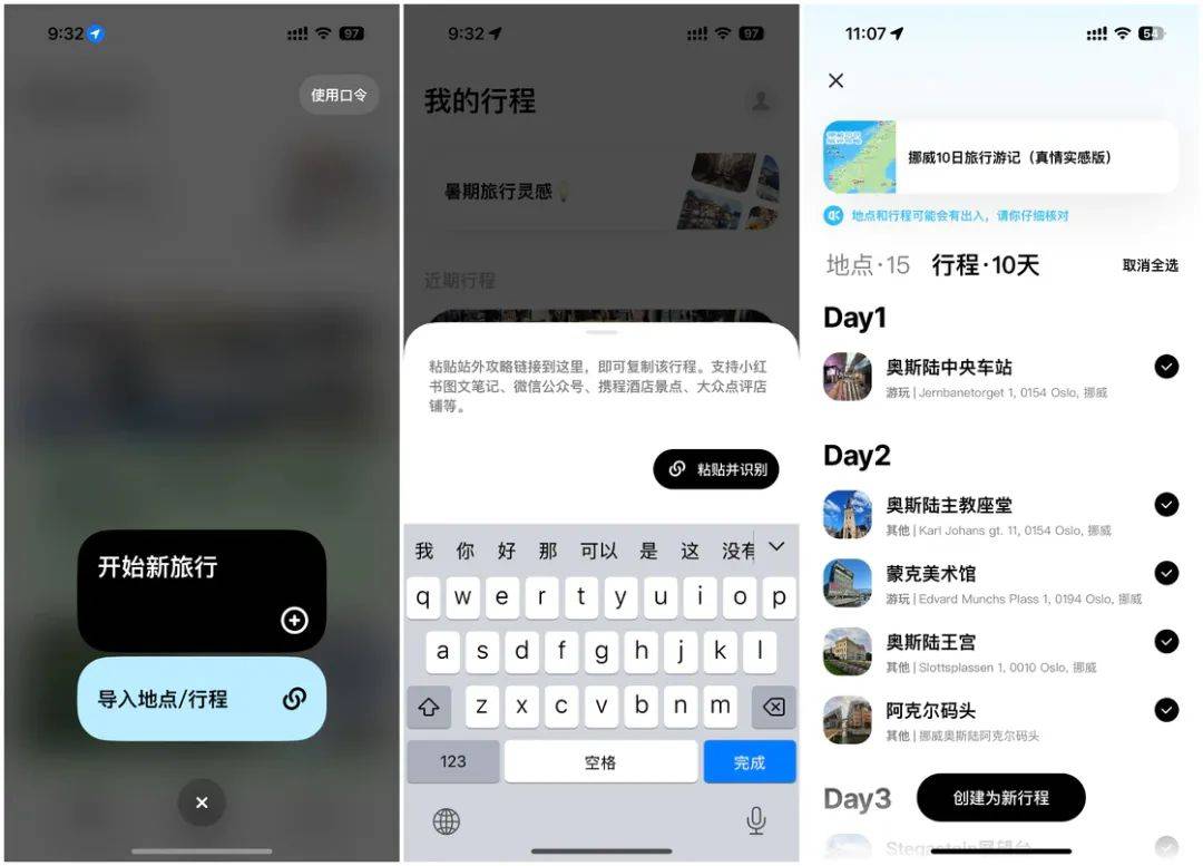 我最喜欢圆周旅迹这款应用的一个功能是「一键抄作业」。我和桃总都喜欢在小红书上看旅行攻略,虽然小红书上有很多有价值的分享内容,不过要将它们整合起来并做成一份自己的攻略还是一件非常费时费力的事情。在圆周旅迹中,应用可以导入小红书、微信公众号等内容平台上的贴文链接,然后自动识别贴文中的时间、地点等关键信息,一键生成一份和贴主一模一样的旅行攻略,可以说是「懒人福星」了。