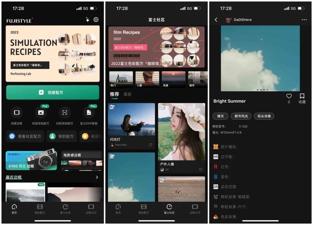 FujiStyle 主要由两个部分构成。首先你可以在应用的「富士社区」中找到用户分享的各式各样的胶片模拟配方。每个配方至少提供一张示例图,你可以根据下方参数自行设置。如果你的机内预设有限,也可以先在应用中收藏,需要时随时从「我的配方-收藏」中调用。