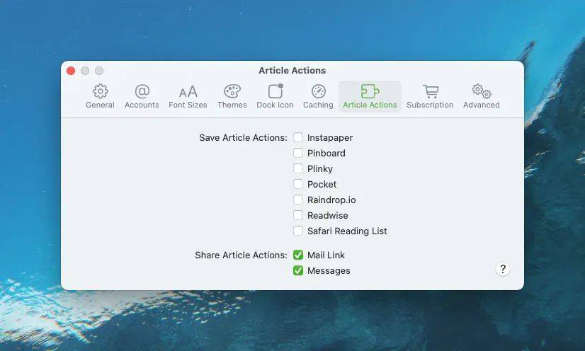 Unread 的 Article Actions 功能可以将文章一键推送到稍后读服务、通过邮件或者信息发送。其中,作为 RSS 阅读器和稍后读服务链接起来,是 Unread 的特色功能。当我们看到感兴趣的文章,可以一键保存到 Instapaper、Pocket, Readwise 等主流的稍后读服务中,以及 Safari 浏览器中的阅读列表。